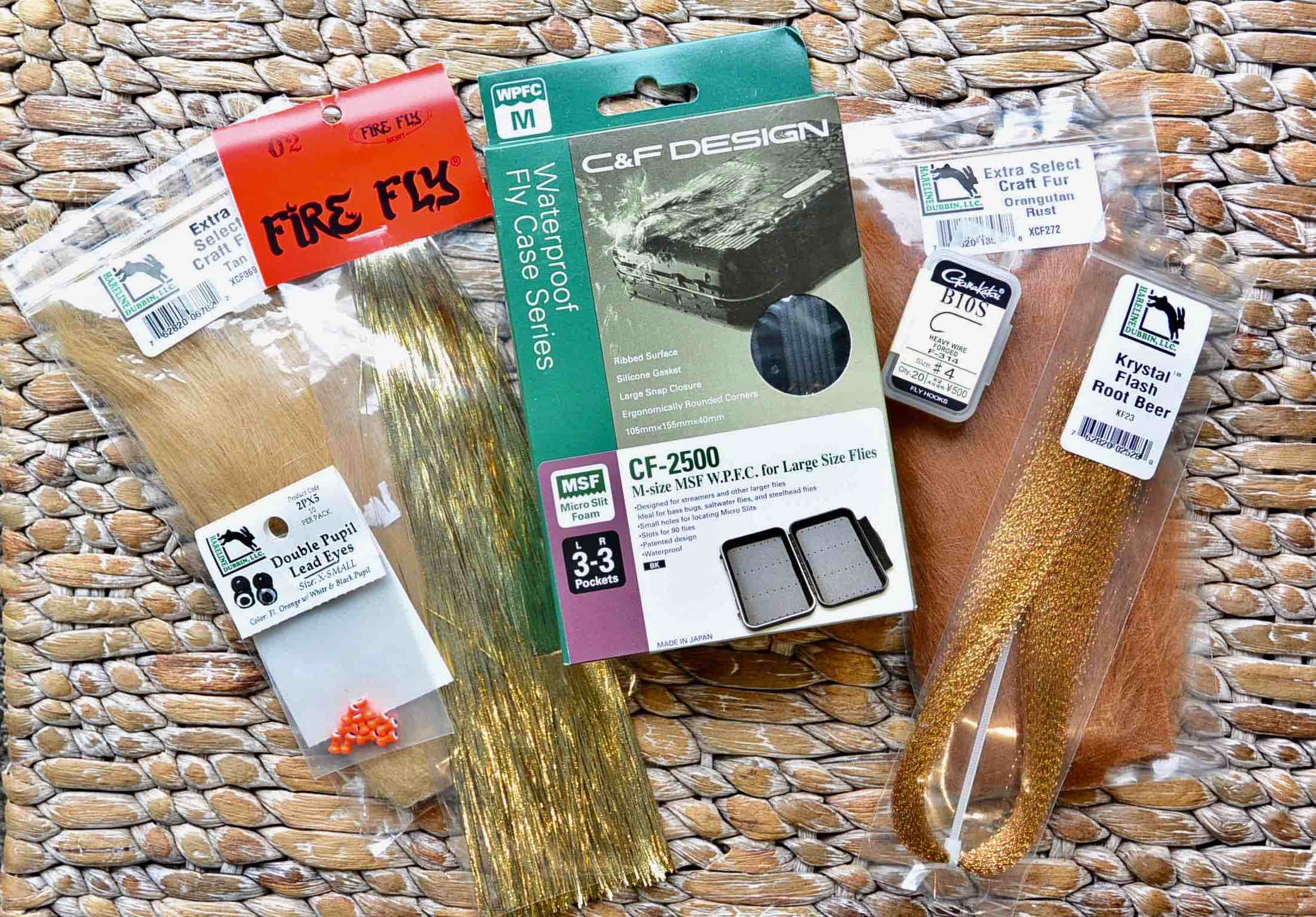 Includes : C&F Design 2500 fly box / Gamakatsu B10 #4 hooks / Orangutang Rust craft fur / Krystal Flash Root Beer / Fire Fly gold flash / Double Pupil Lead Eyes / Craft Fur Tan. WOW what a raffle prize!!!