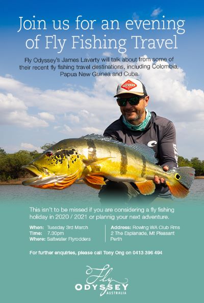 This coming meeting, we have James Laverty from Fly Odyssey Australia presenting some trips that they have on offer. Fly Odyssey Australia is a specialist fly fishing travel booking agent. James is coming along to showcase some of the trips that they have on offer in the next 12 months. Lots of awesome locations, and there might be a fish pic or two to drool over.