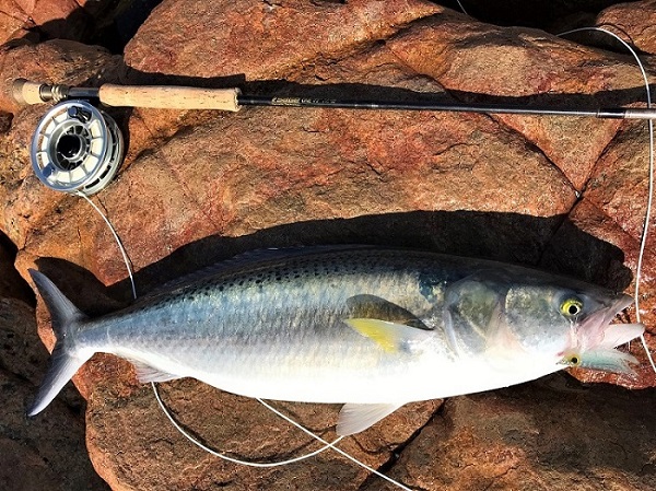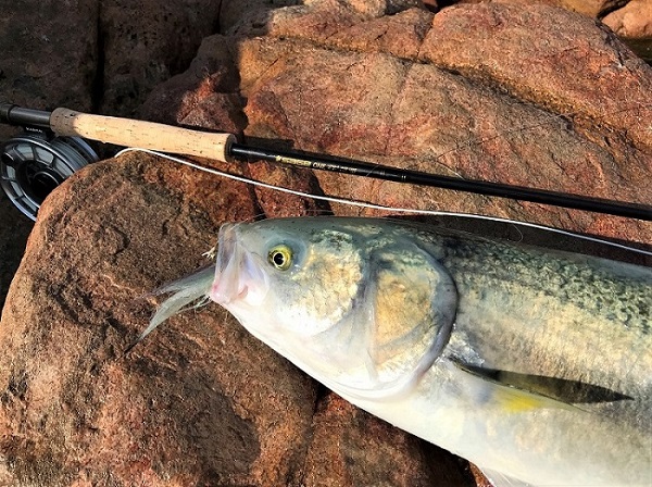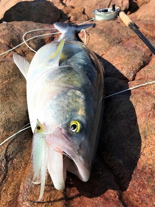 Hey guys, thought I would just share some pics from a quick Salmon session I had while down south for a wedding over the last long weekend. As usual the Salmon were hard to find (be in the right location at the right time/day) with no big schools around like the week before (apparently!:-(). On the Sunday morning I covered many of the usual haunts, Canal rocks, Castle rock, Meelup all the way to Rocky point then around to Bunkers without seeing a fish or even anyone catching a fish. On the Monday I had a 2 hour window (8.30 - 10.30am) so I headed straight down to Bunkers walked all the way to the rocks at the Eastern end (past many hopeful lure & bait chuckers), found a fly fishable rock ledge with few other anglers around and set my gear up. After only about 30 minutes a small pod of Salmon (8 - 10) came past and I placed a 60 -70 ft cast out in front of them and they were on to it immediately, I hooked up and after some tense moments around the rocks landed my first Salmon for 2021. After that a few more pods came through, I busted one off and landed one more for a very satisfying fast Salmon session.