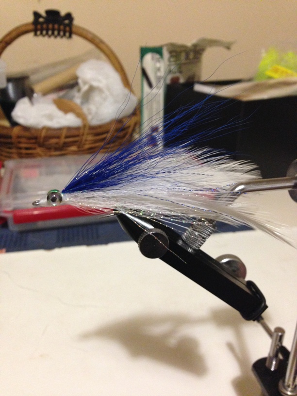 Below is my first attempt at a Leftys Deceiver in blue over white. I tied it a little too far back on the hook