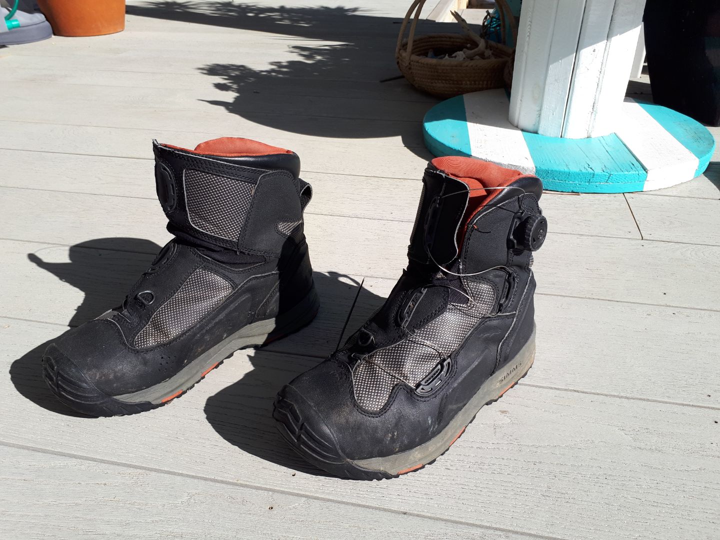 I have a pair of sparsely worn Simms wading boots featuring the stainless steel Boa lace system....no laces to tie.