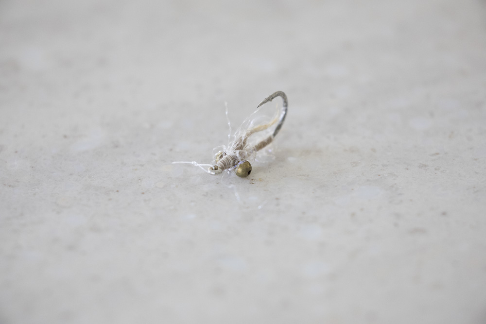 This is one of Steve's flies that got bashed up on the salmon. Missing half a dumbbell eye, as well as a snapped hook.