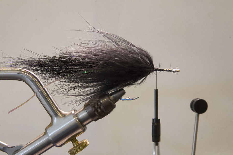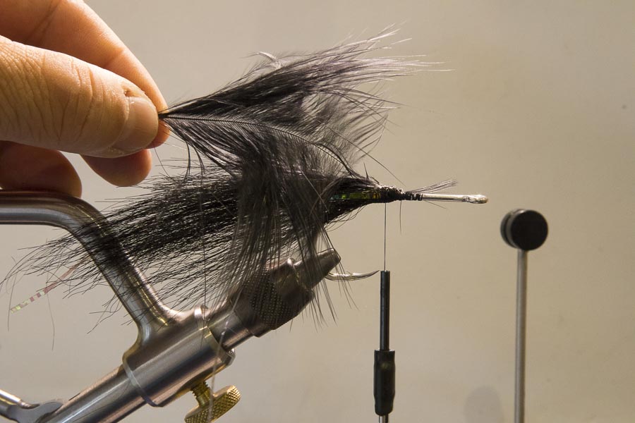 Be sure to keep brushing out fibres, so they aren’t trapped under each wrap. Two marabou feathers used here, but it all depends on what quality of marabou you have on hand.