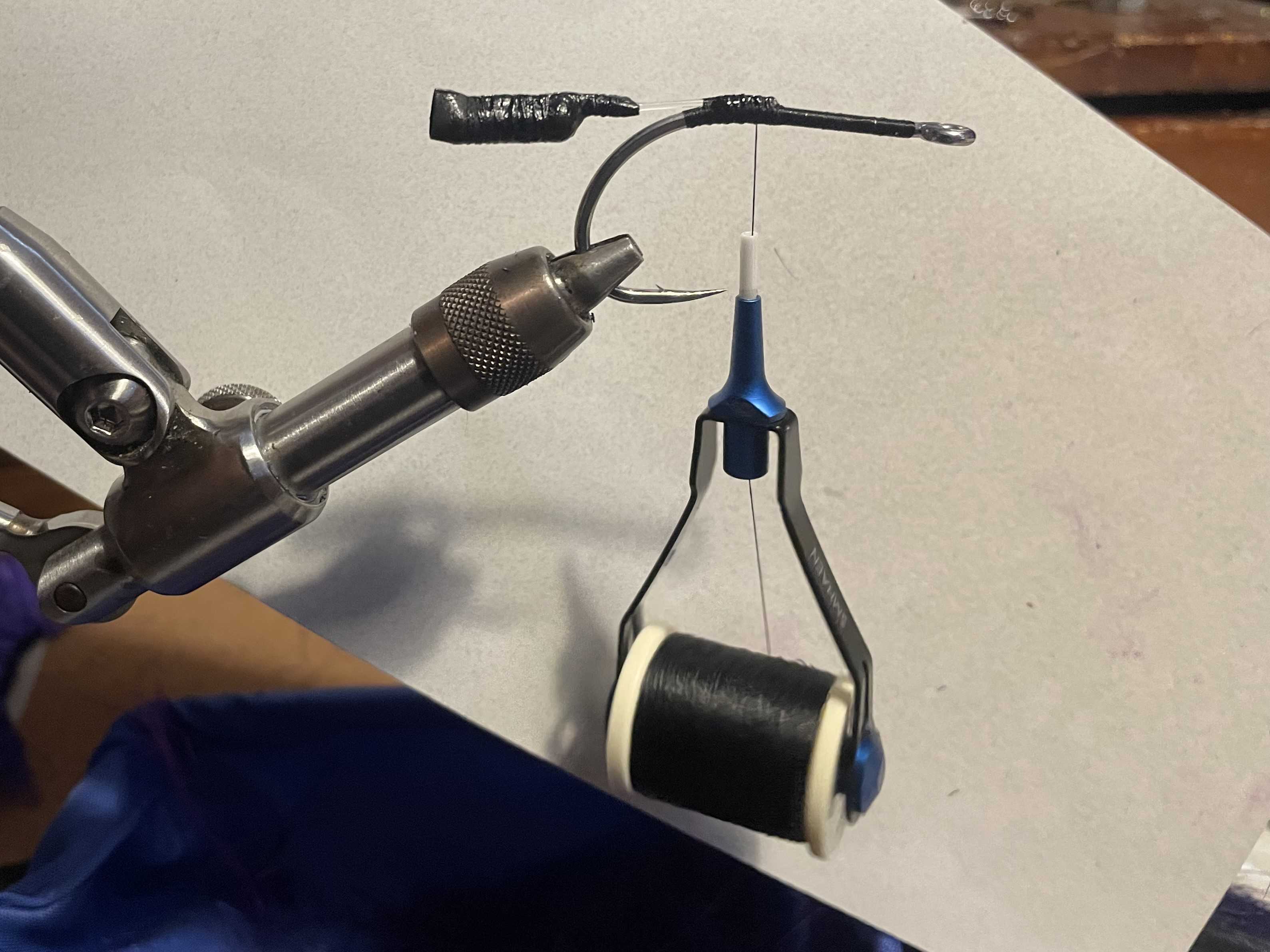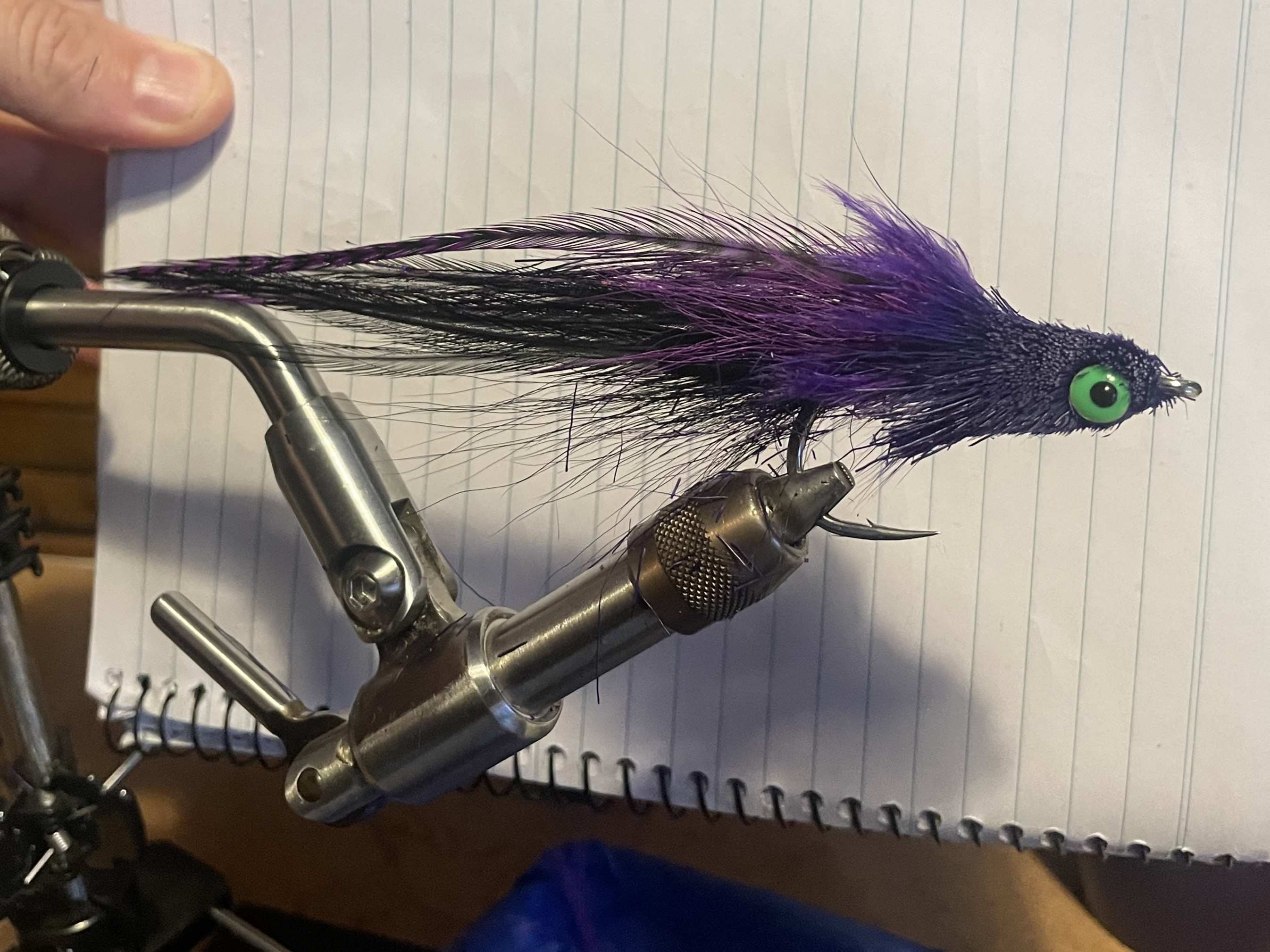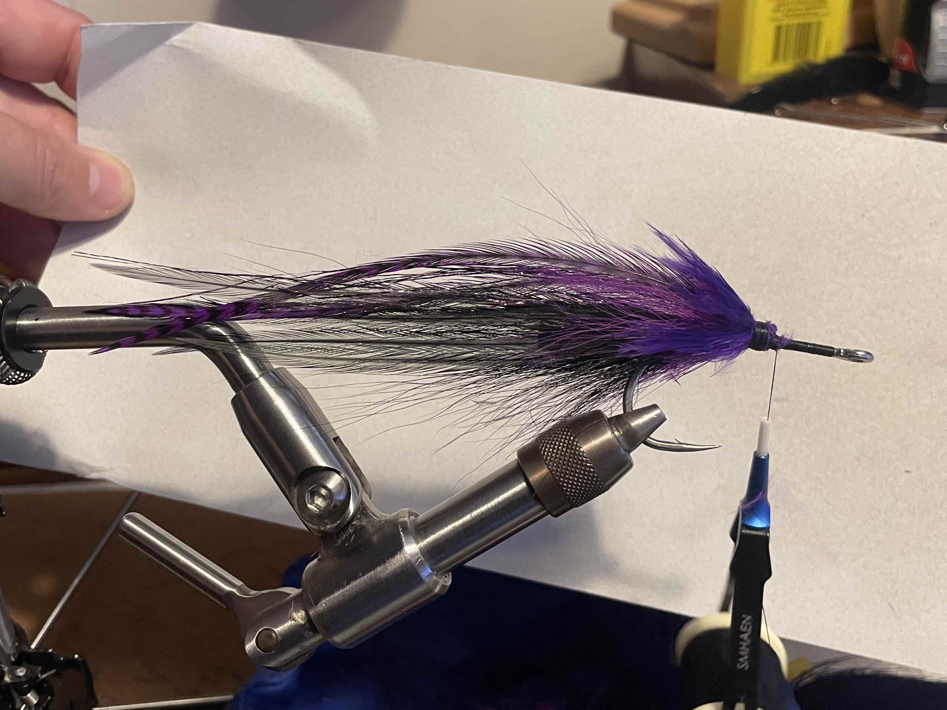 I'm tying up some back/purple patterns for estuarine (fast flowing tannin water) tarpon, and thought I'd take some photos for an "On the Bench".