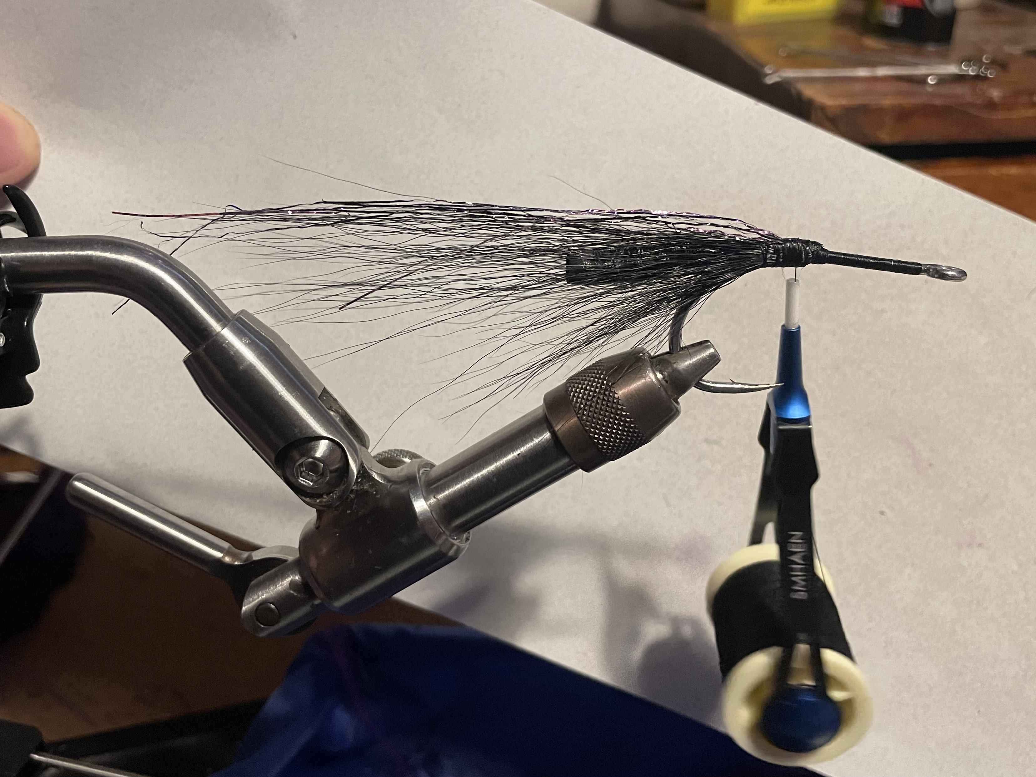 Tie in (black) bucktail top (as long as you have), and below (a little shorter). Tie in 3 or 4 strands (doubled over) of flash (Violet scale drop in this case)