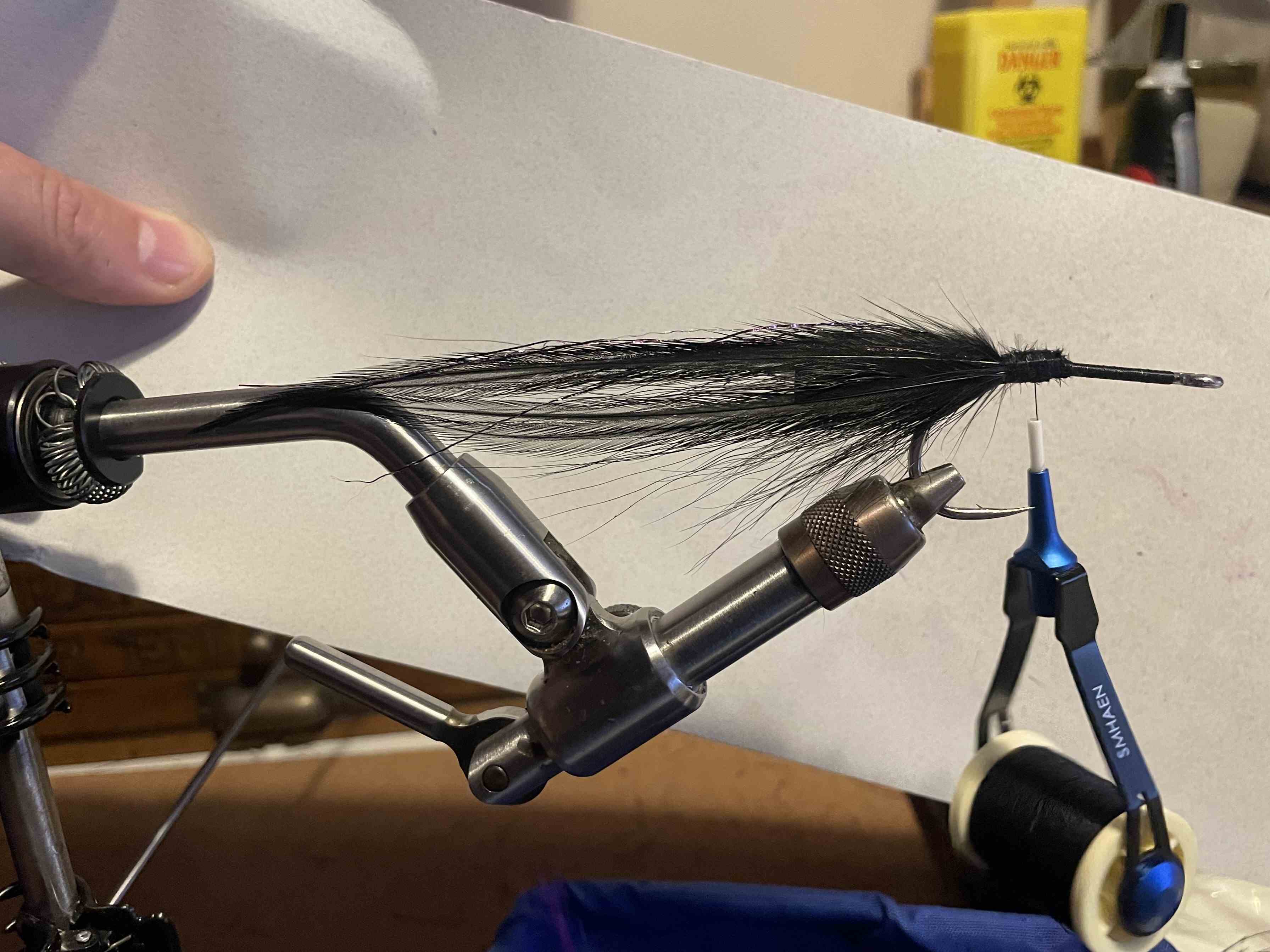 Tie off (whips can be hard so sometimes a few hitches need to do). Shave with a new razor blade. Use the eye and the hook barb as a guide to line it up. I didn't want the large bushy style of the Andino, so I trimmed it into a semi wedge - with the eyes guiding the thickness.