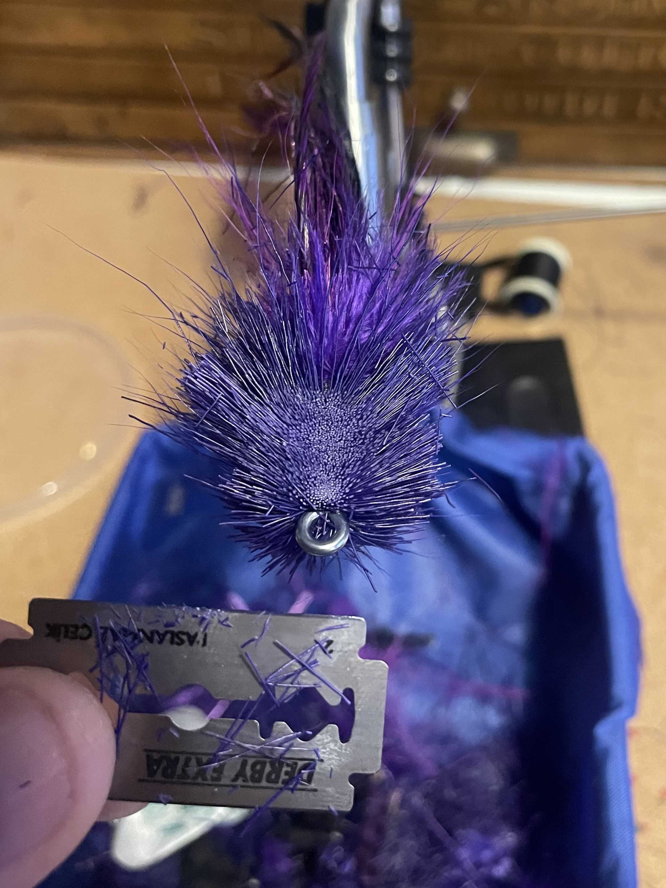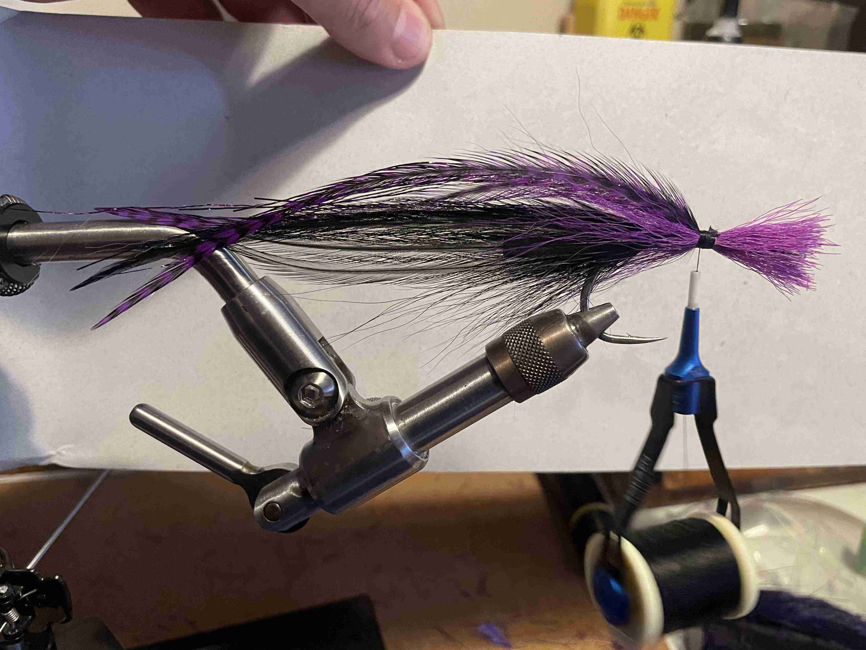 I'm tying up some back/purple patterns for estuarine (fast flowing tannin water) tarpon, and thought I'd take some photos for an "On the Bench".