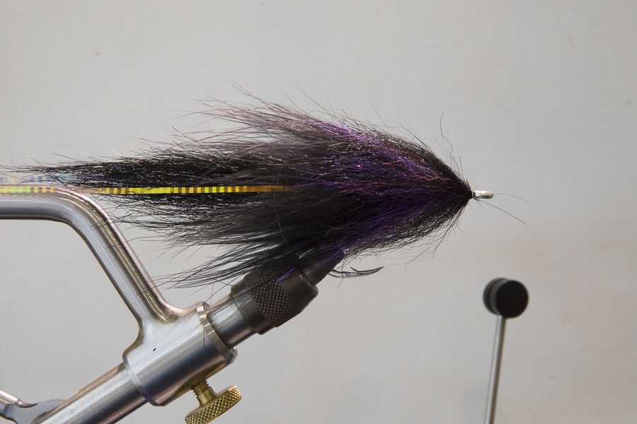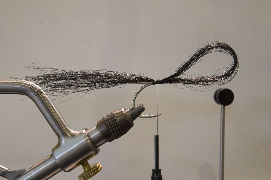 Step 3. Second stage of tying in the tail. This time, ¼ length of material is used. This gives a nice taper to the tail. Again, top this with some EP Sparkle flash. You will also need to add some EP gamechange to the bottom of the hook.