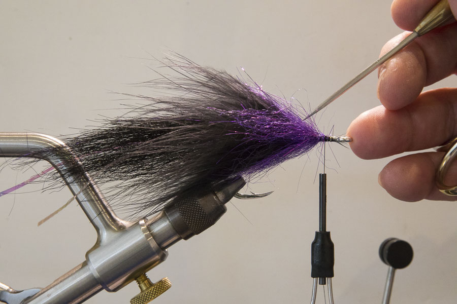 Step 9. Eyes. I like adding eyes, as to me it completes a fly. Fish Masks by Fish Skull are a nice way to finish off the fly. Super glue gel to fix fish mask to fly. Build a small dam of thread between the mask and hook eye, and seal with either head cement or uv glue. This will help keep the fish mask from slipping off.