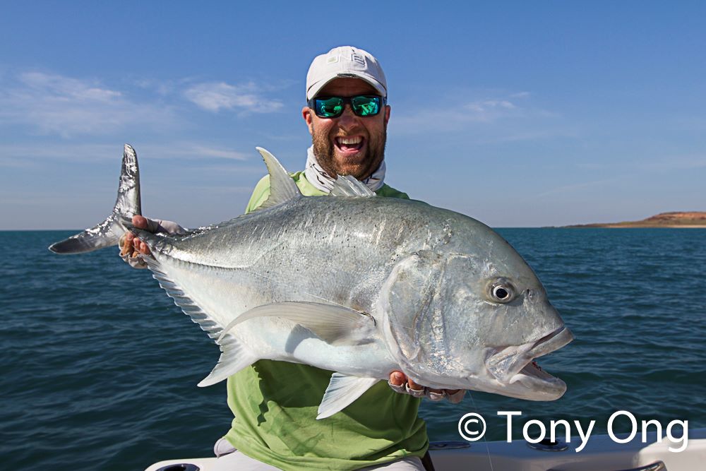 Well, the monkey was finally off my back. Like the east coast of Australia, when the drought breaks, it buckets down. A group of us were back up in Exmouth over Christmas, a couple of months later. I was back fishing with Steve. Day one of the trip, and the weather was perfect. Low winds, cloud cover was light. Where to go. Well, straight back to the GT flat of course. Result was fish number 2 at 1.08 meters. Again, this fish was in shallow water. Take was the same and this fish took a little more line.