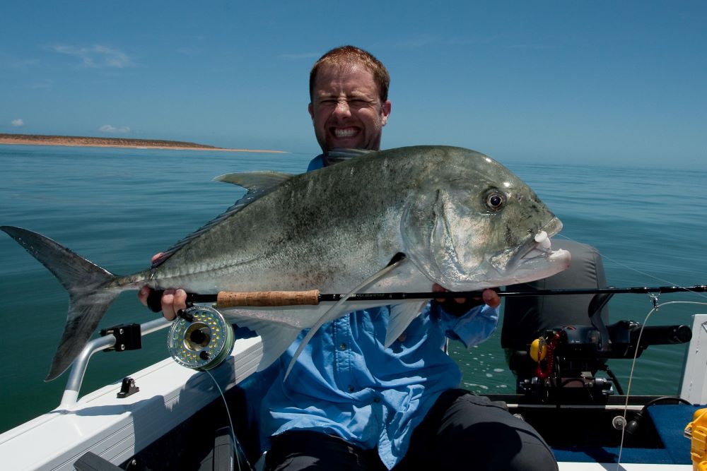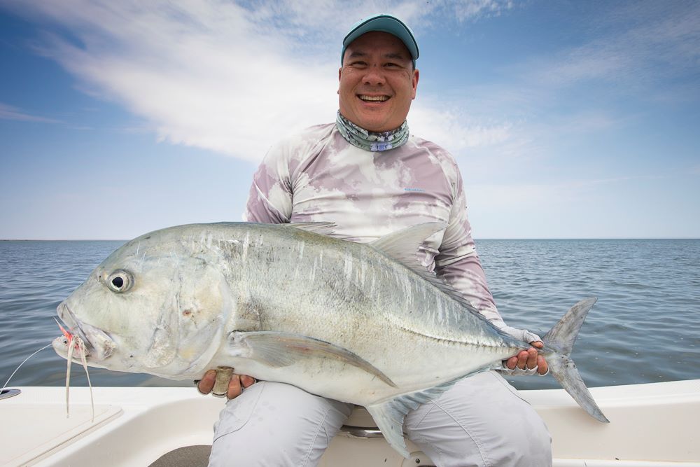 Fish number 3 was a New Year’s Day present. We headed to Murion Island, as weather forecast said conditions were favourable. Well, it turned out a tad lumpy. Arnold and Eric picked one island, and Steve and I fish the other. The area that we fished regularly in the past was quiet. We continued further along into some areas that we had not fished much in the past. Maybe the tide turned, or for whatever reason, we started seeing fish. Schools of permit, spangled emperor, meter long queenfish, then came along the GT’s. At this stage, we had permit flies in hand. Didn’t take long to change out to the GT rods. We had a pod of 4 GT’s come streaming within casting range. I got a lucky cast into the right spot, and it was fish on. This one taped out at 1.07m. This was a smaller fish, however, this one had more water to play with, fresh oceanic flow water, and a minefield of bommies. Boy did it go hard. A little bit of careful driving, and fighting tough saw the fish in the net.