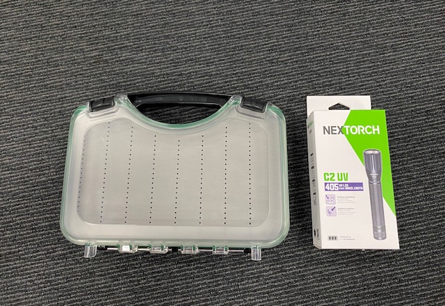 NEXTORCH Professional UV torch with 405nm black light - 100% waterproof offer you can also use it as a UV torch to set your glue. Also Large Todd double sided fly Box you can fill up with disco shrimps