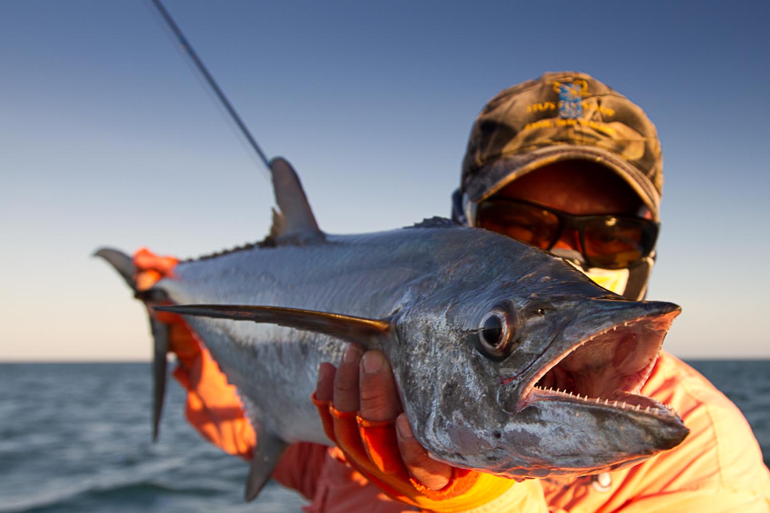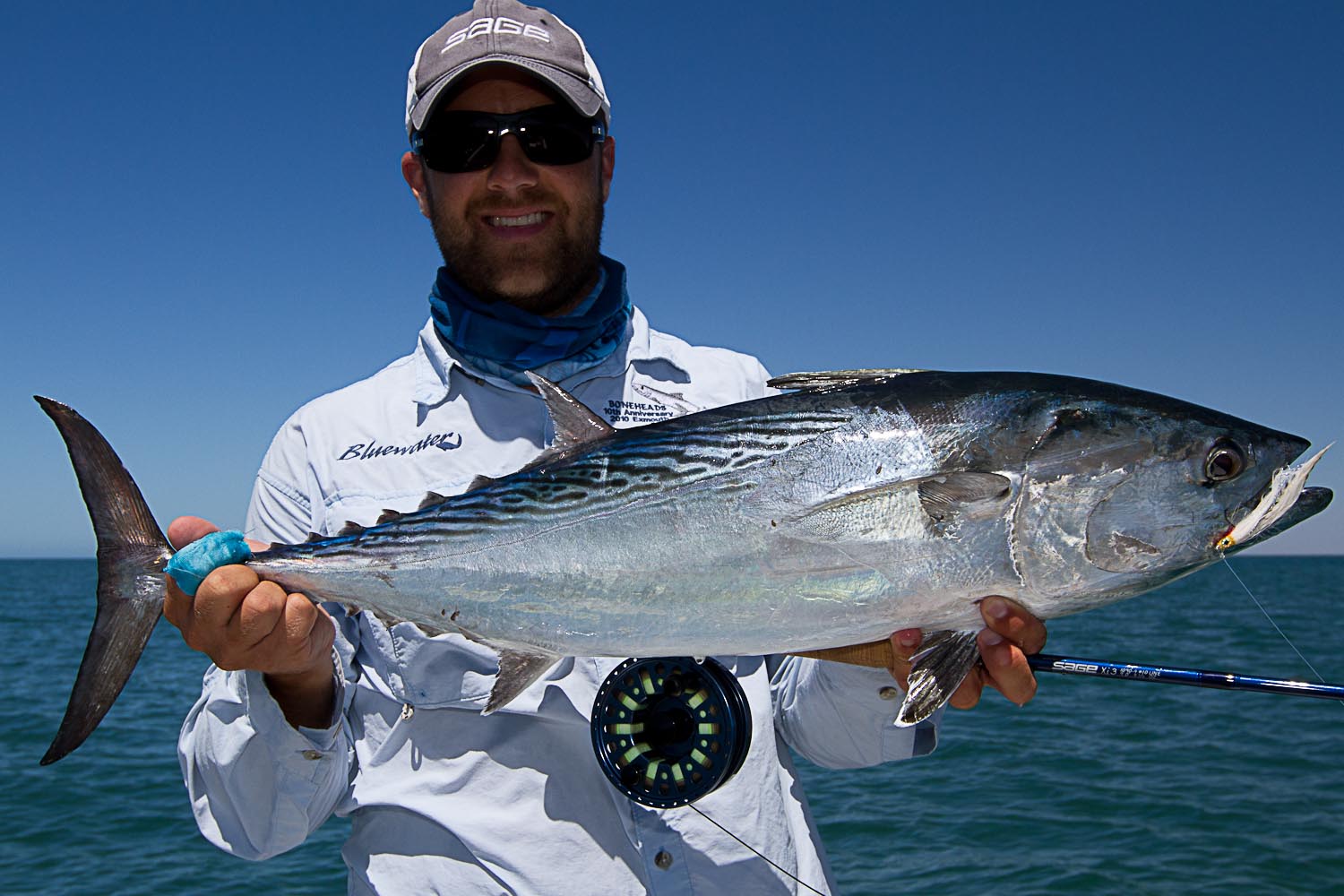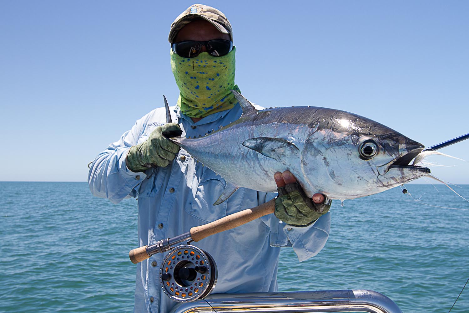 This was to be the last of our days crossing the gulf. Arnold and his crew had found bait stacked up in front of Bay of Rest. Five minute run to the spot, in the lee of mainland, it was a no brainer where we were all headed the next day. With the amount of bait around, you'ld think that we were in for the time of our lives. Unfortunately, there was probably more bait than preditors around. We still had to work hard for the fish. Charging into the schools just seemed to put the fish down. We all opted on long drifts, with fingers crossed that we would happen onto a bait ball when the preditors found them. Feeding were goldens, giant trevally, gold spot trevally, mack tuna, longtail, school mackerel, and the half dozen other species that I've probably forgotten to mention. Some of the school mackerel were reasonable. Delvin found some funny wrasse looking fish on a flat. He managed to hook and land one. Would need some help with fish id. More to come.
