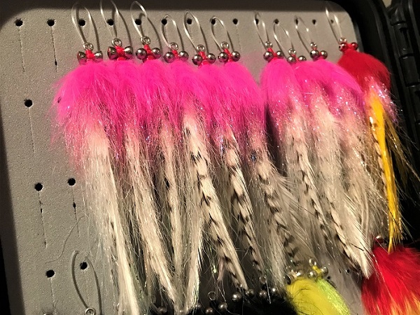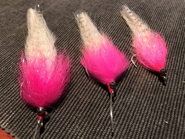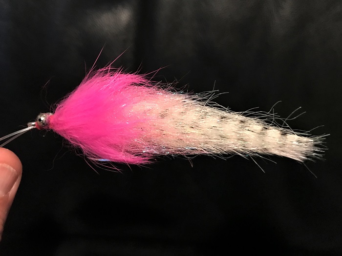 Collar/head – 2 x pink schlappen hackles wound around the hook shank (original) or some modern versions use marabou tied in, crosscut rabbit strip or EP brush wound around the shank.