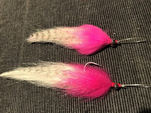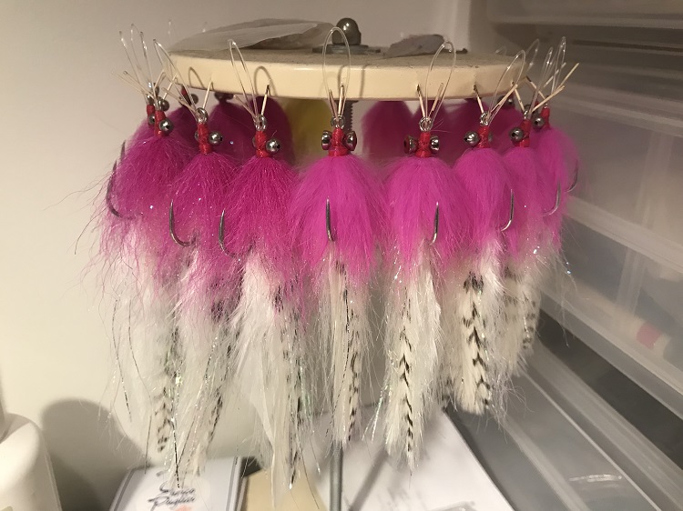Tail – A small clump of white bucktail tied in first (or tapered game change fibre) with 4-6 white saddle hackles (2-3 tied each side of the hook shank) approx 2.5 x the hook length over the bucktail, plus 1 x pair of grizzly hackles over that for fright stripes.